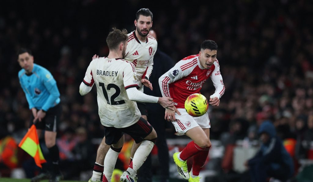 اعتذر مهاجم أرسنال جابرييل مارتينيلي لظهير ليفربول الأيمن المصاب كونور برادلي بعد محاولة دفعه خارج الملعب قرب نهاية المباراة التي